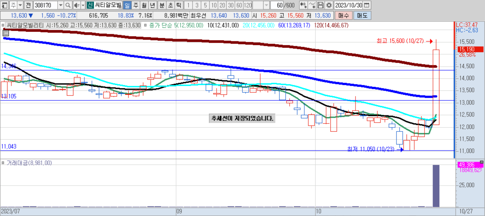다음은 씨티알모빌리티이다. 우선 직전 고점을 뚫은 것으로 보이고 흐름도 좋아 보인다.